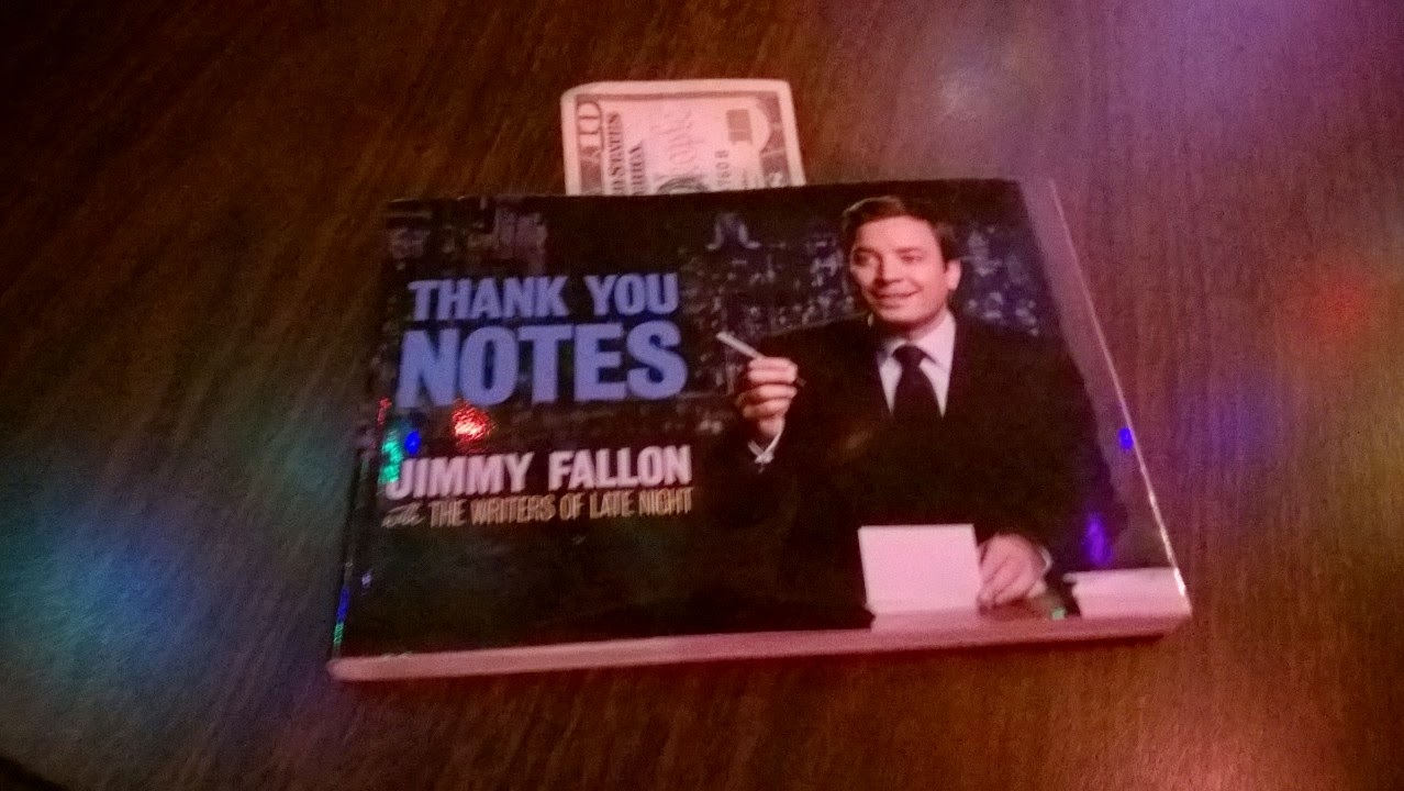 Ja palkintoni oli mieltä huumaava: 10 dollaria juontajan taskusta sekä Jimmy Fallonin kirja. Ah, kyllä tällä lyö leiviksi!